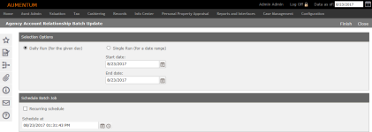 On the Agency Account Relationship Batch Update screen, select Daily Run to define a specific day (default) or select Single Run to define a date range for the batch process update to occur.