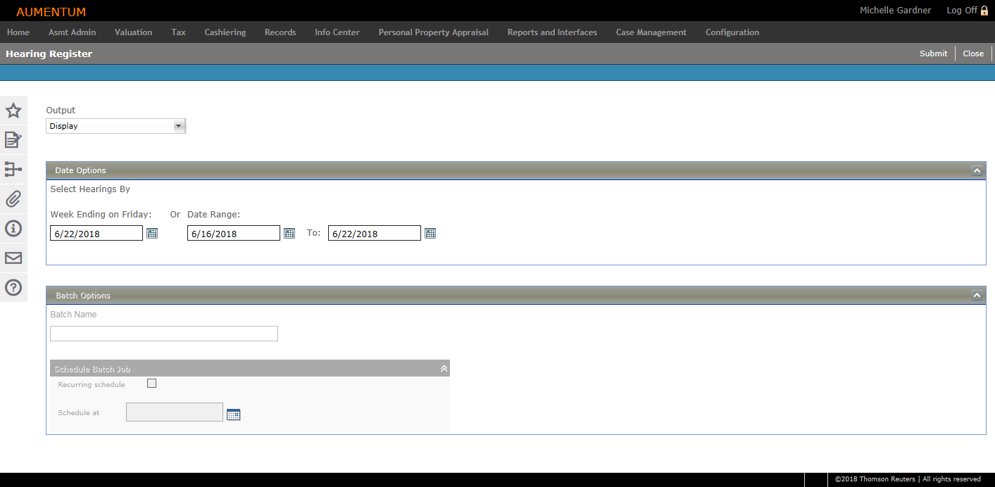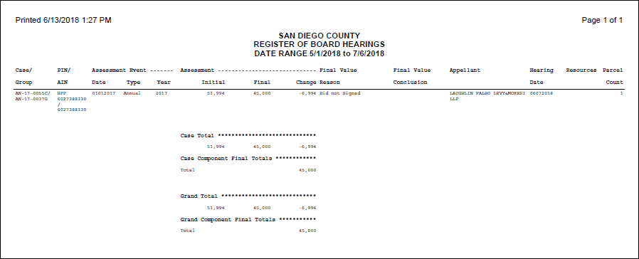 The Hearing Register Report provides a list of the results or actions taken for hearings held during the entered work week or date range, by case number. It also includes value impact results for cases that match the range specified.
