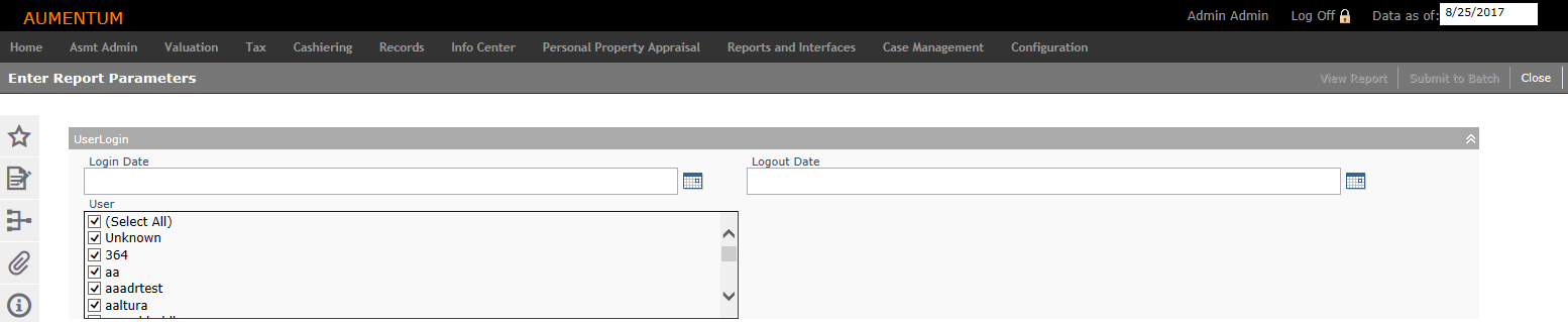 Print a report summarizing the length of time the selected users were logged into Aumentum for a specific date range.