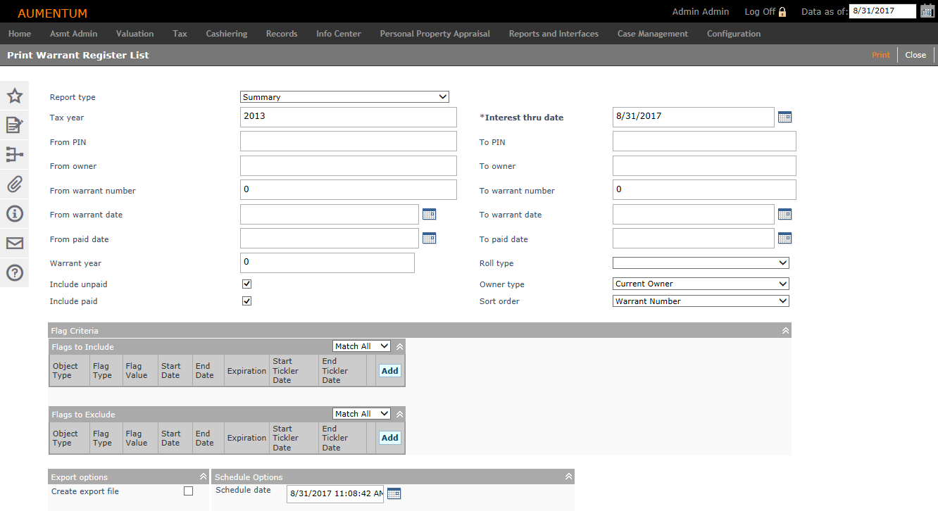 Select the options for your report. You must at least enter a Tax year or a Warrant year to print this report.